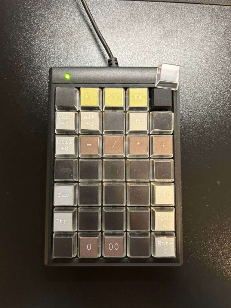 私のワークフローでは、数値入力も左手で行います。 「ショートカット用」と「テンキー用」でデバイスを2つ置くのは邪魔です。 「テンキー(数字)+ショートカット」が無理なく収まる、30キー前後のデバイスが、CADオペレーターの黄金比だと確信しています。